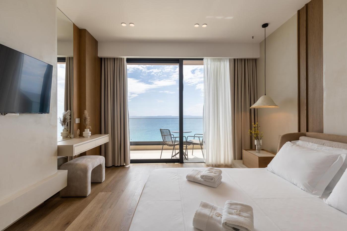 Deluxe Double Room with Balcony and Sea View. The spacious double room provides air conditioning, soundproof walls, a balcony with sea views as well as a private bathroom featuring a walk-in shower. The unit offers 2 beds. ;